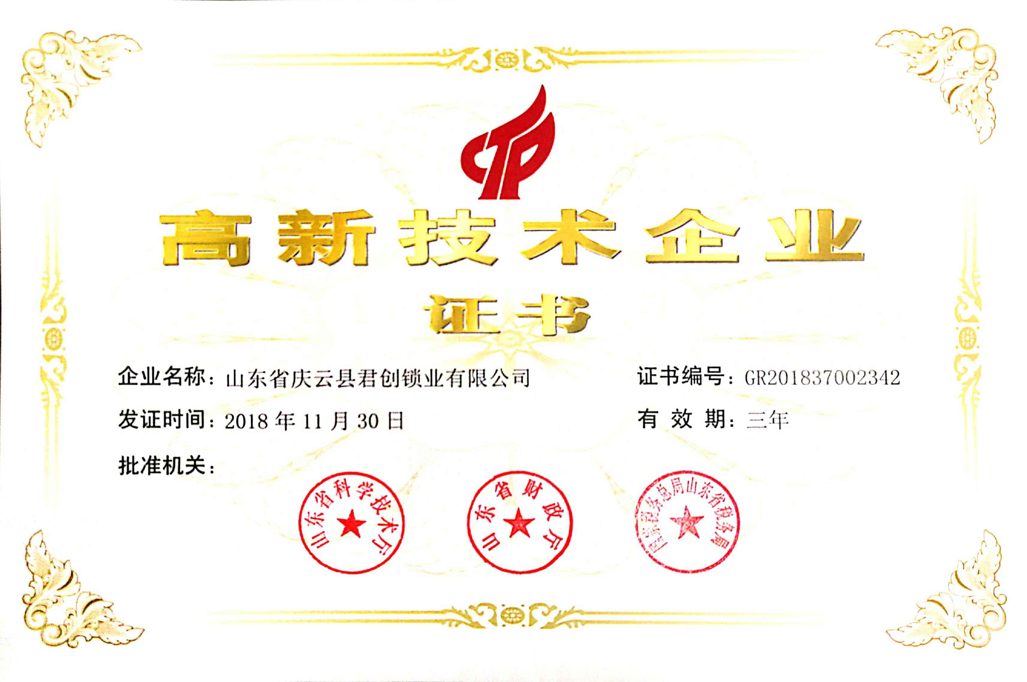 近日,济南晋浩职业素养提升有限公司喜迎佳音,获得了“国家高新技术企业证书”。这是济南晋浩职业素养提升有限公司继获得山东省产品质量奖、德州市信用民营企业、等荣誉后获得的一项新的荣誉。